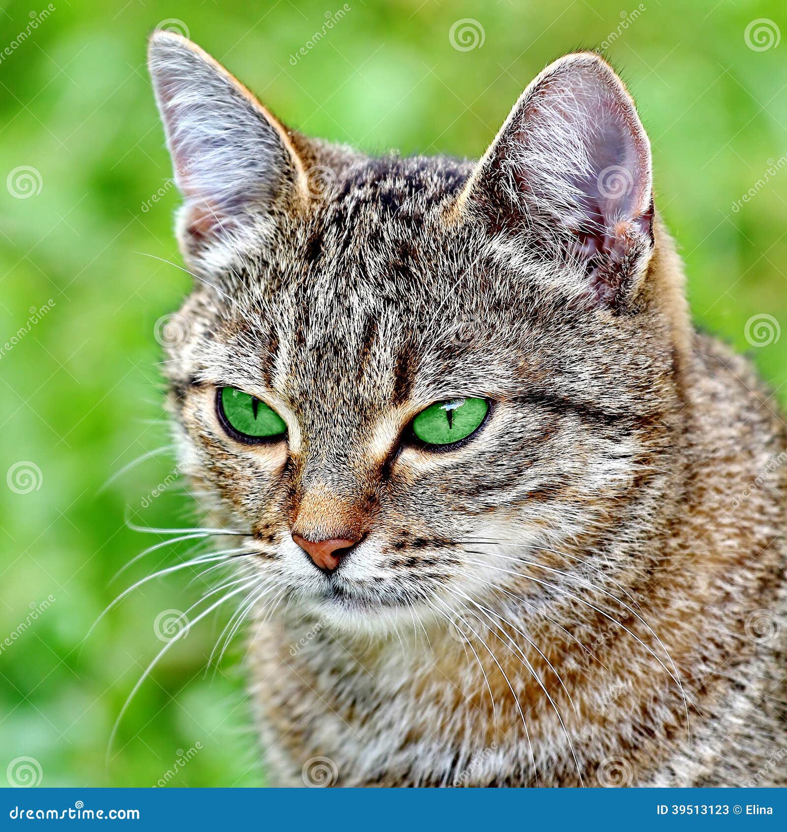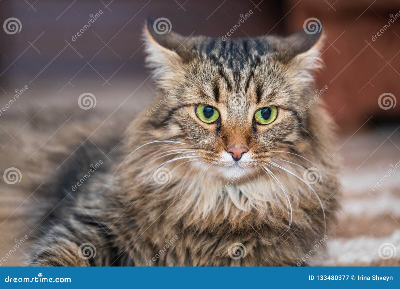 Brown Mackerel Female Cat With Green Eyes Siberian Stock Photo