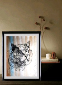 Modern Unikat Original Gemalde Portrait Einer Katze Papier 28x32cm
