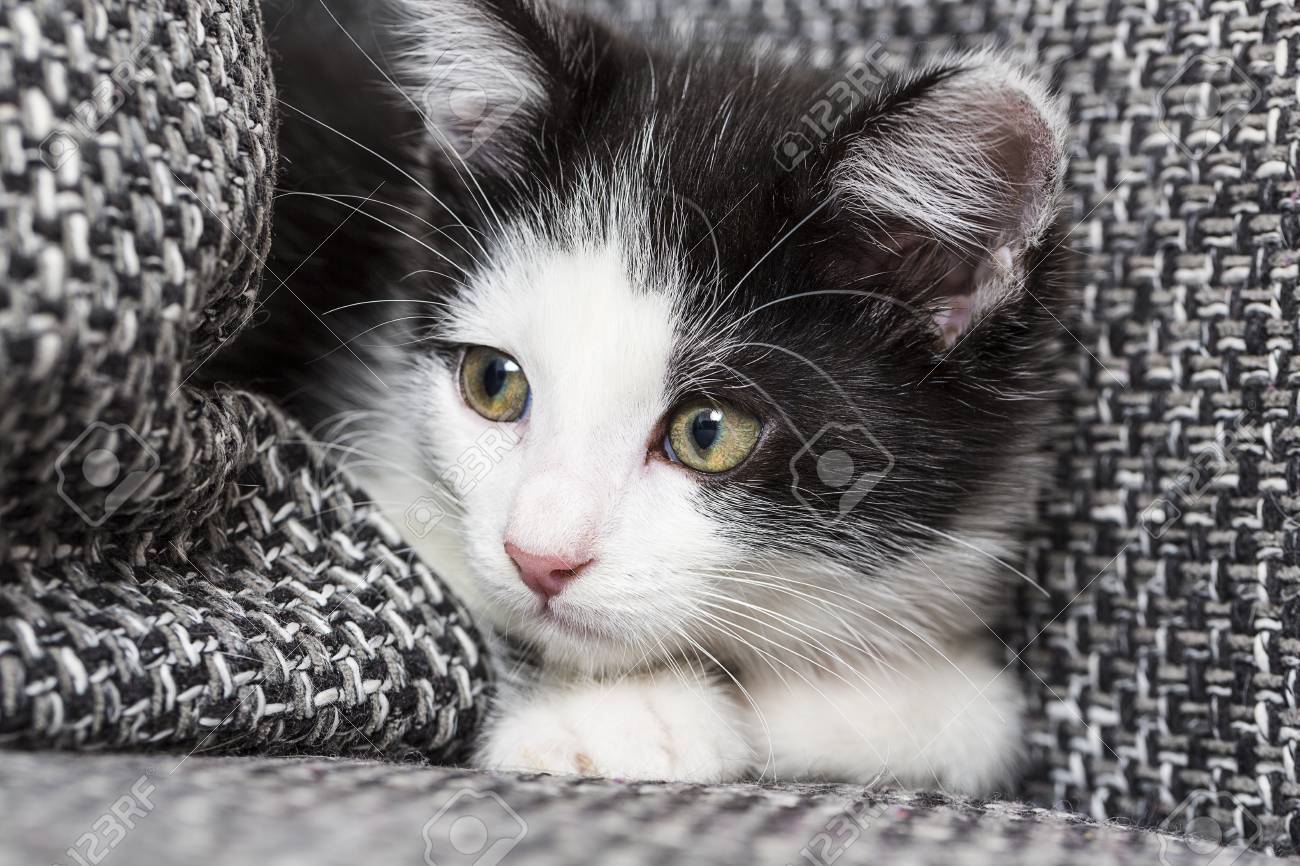 Couch Katze Junge Grau Weiss Liegend Mude Portrat Tiere Saugetiere
