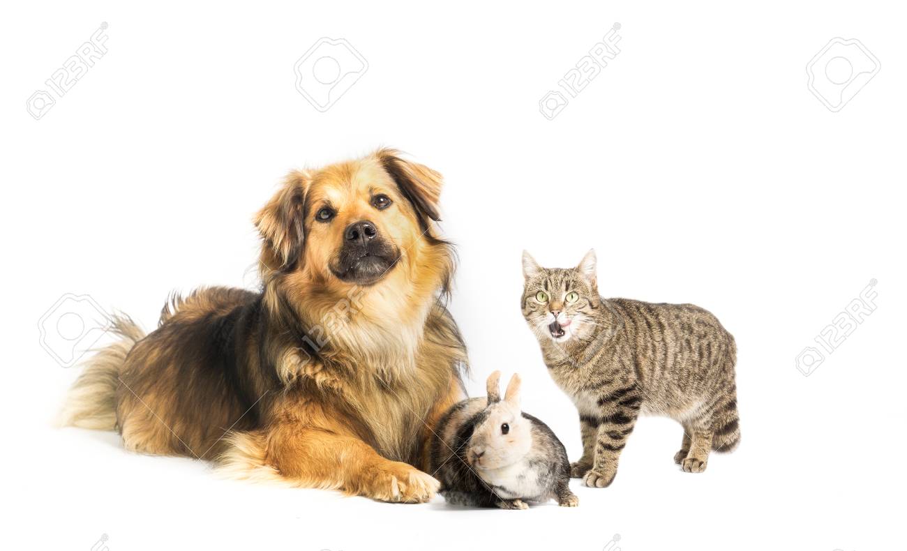 Hund Katze Und Kaninchen Im Studio Mit Weissem Hintergrund