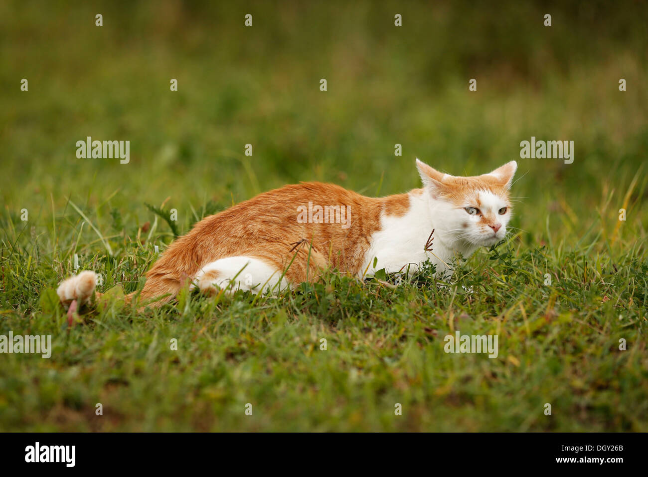 Rot Weiss Fleckig Katze Sitting Auf A Wiese Stock Foto