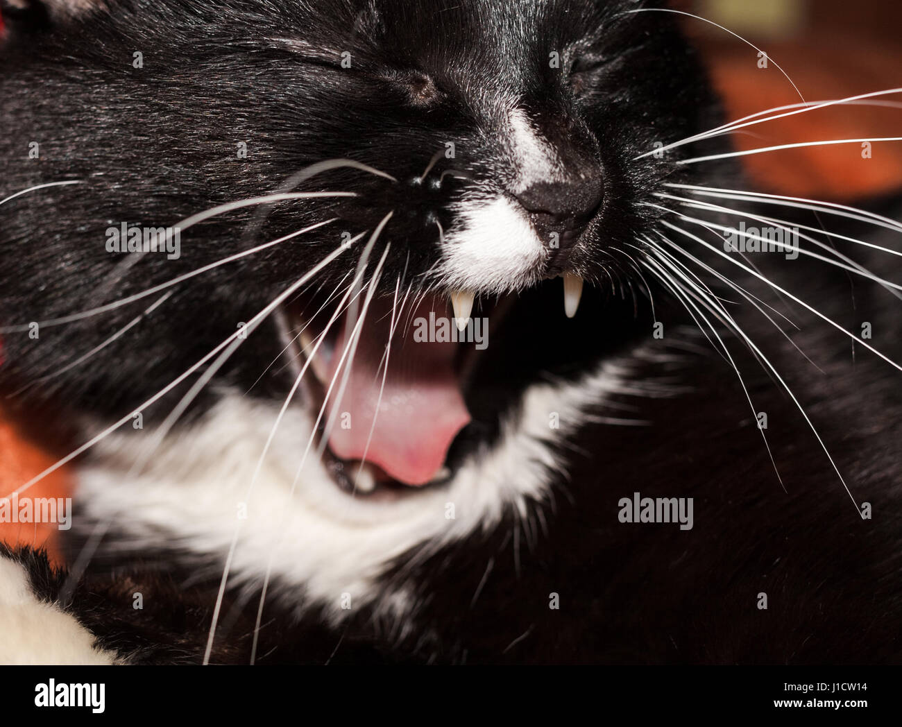 Schwarze Und Weisse Katze Augen Nahaufnahme Wutend Fauchen Katze