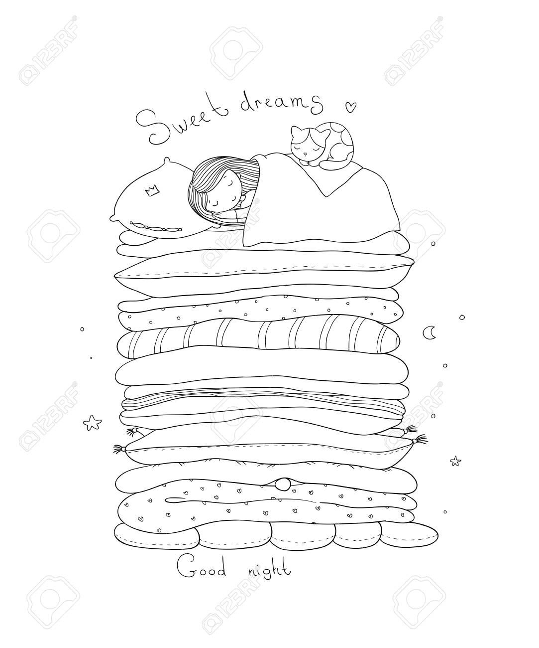 Schlafendes Madchen Und Katzen Gute Nacht Susse Traume Vektor