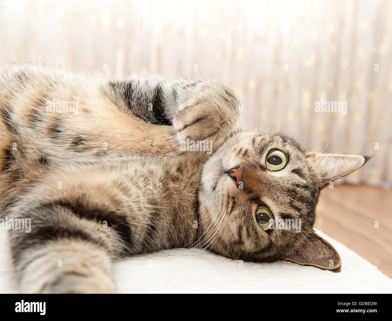 Tabby Katze Liegend Auf Seite Und Schaut In Die Kamera Stockfoto