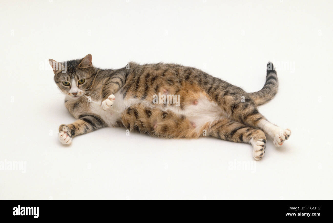 Schwangere Tabby Katze Liegend Auf Seite Stockfotografie Alamy