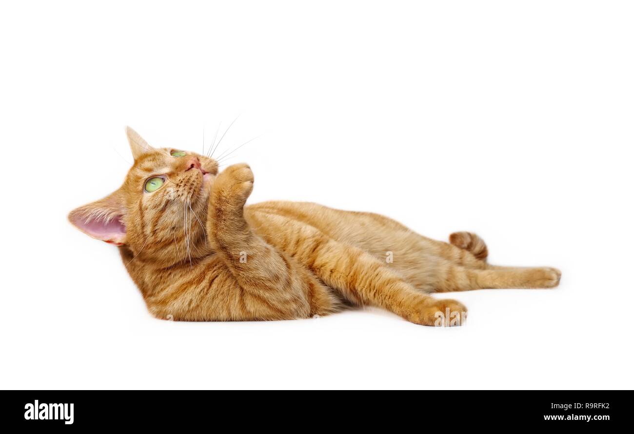 Ingwer Susse Katze Liegend Seite Blick Auf Weiss Mit Kopie Raum