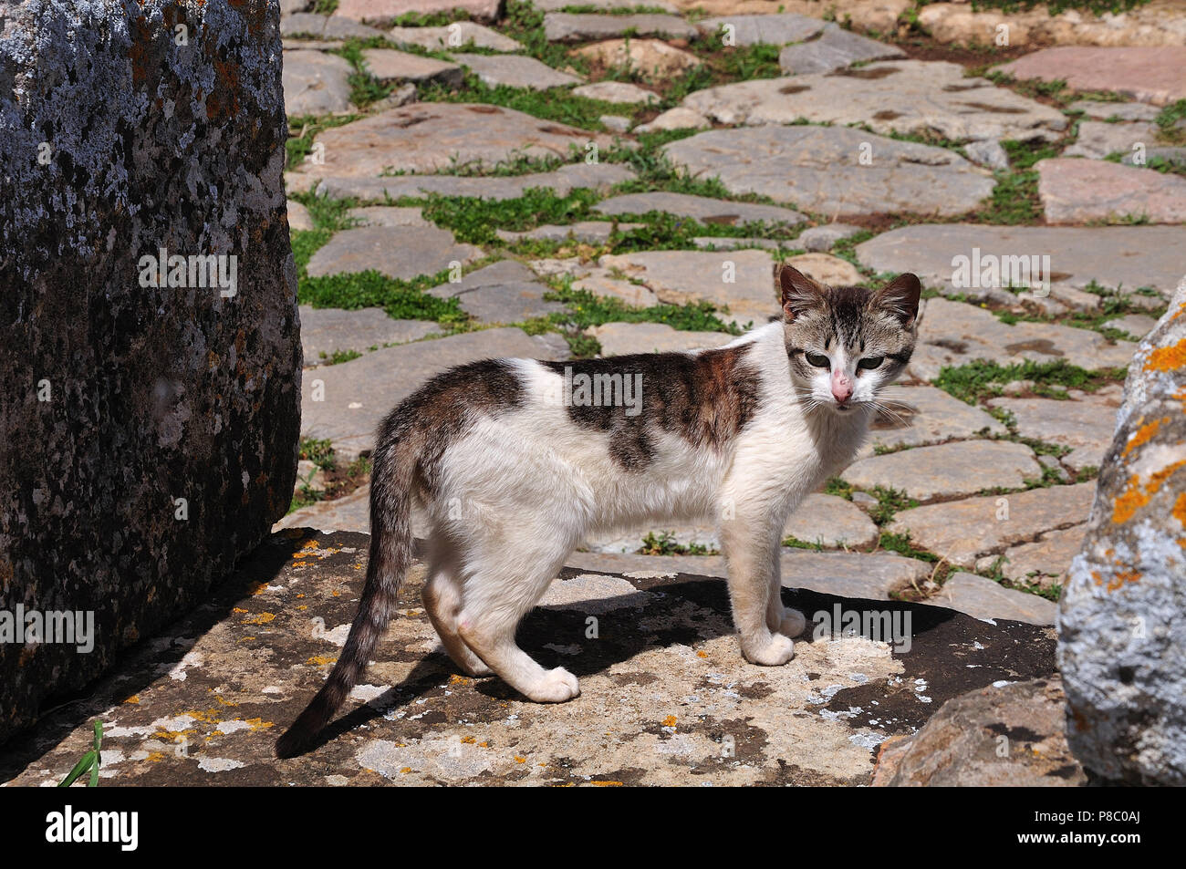 Weisse Katze Mit Gestromten Flecken Auf Steinboden Mit Flechten Im