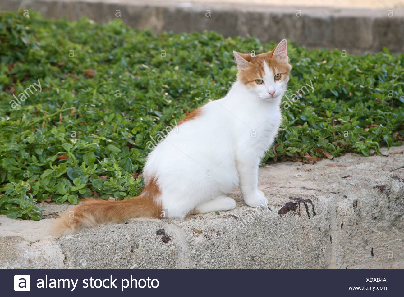 Katze Weiss Rot Sitzende Aussen Tier Haustier Hauskatze Zweifarbig