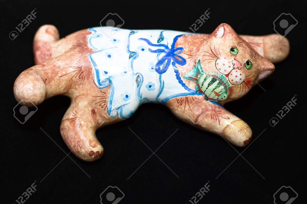 Keramik Figur Einer Katze Mit Einer Halskrause In Den Zahnen Auf