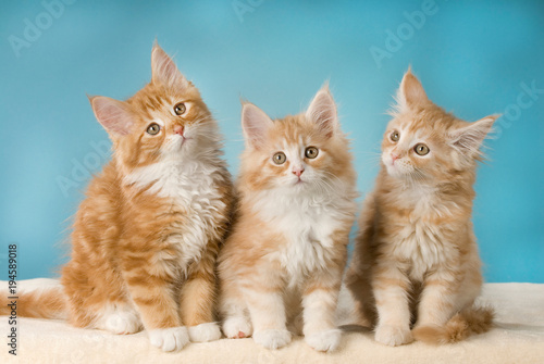 Drei Rot Weiss Getigerte Maine Coon Katzchen Auf Blauem Hintergrund