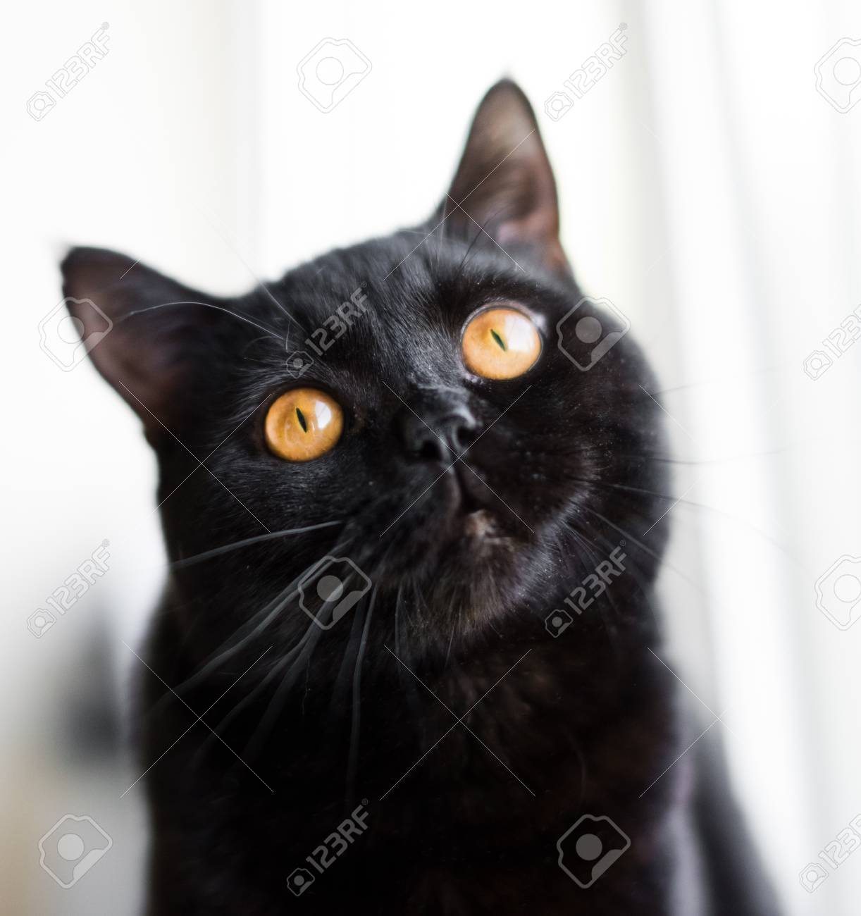 Schwarze Katze Mit Gelb Orange Augen Am Fenster Mit Weissen Vorhang