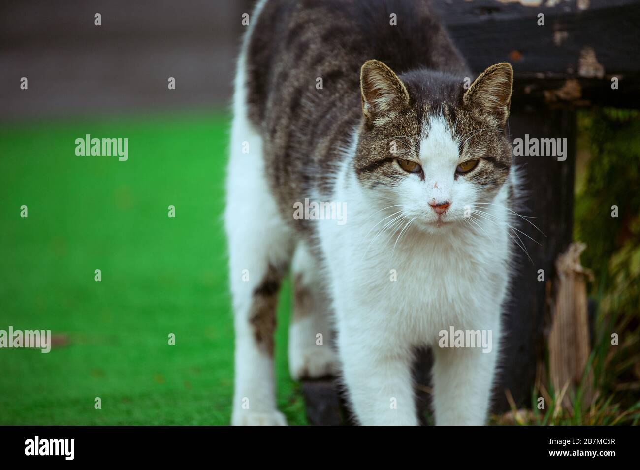 Eine Weiss Gefleckte Strassenkatze Sitzt Auf Einem Zaun Katze