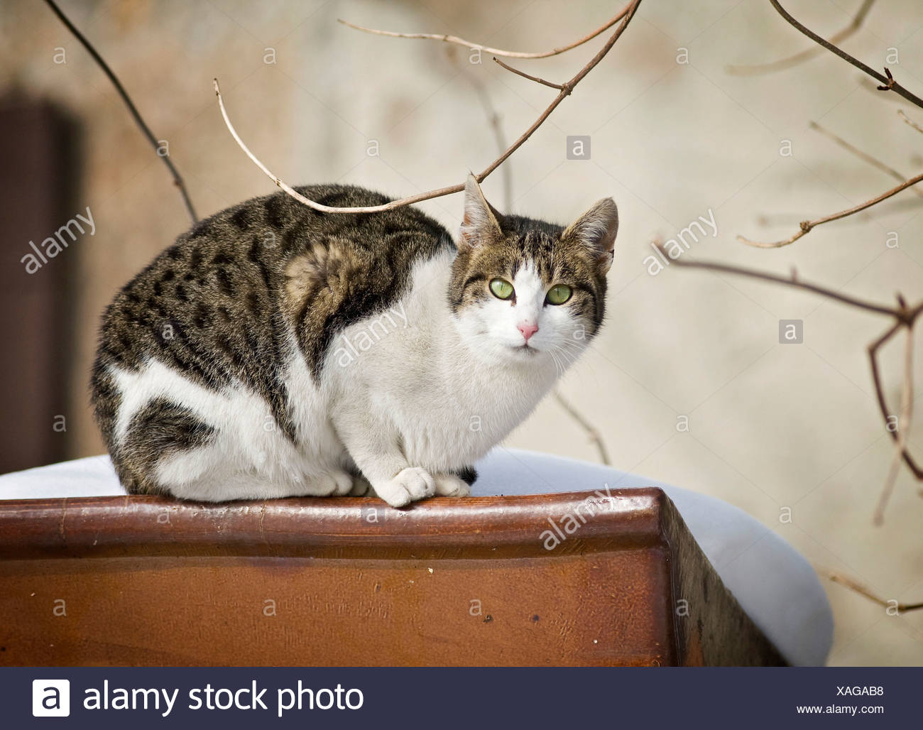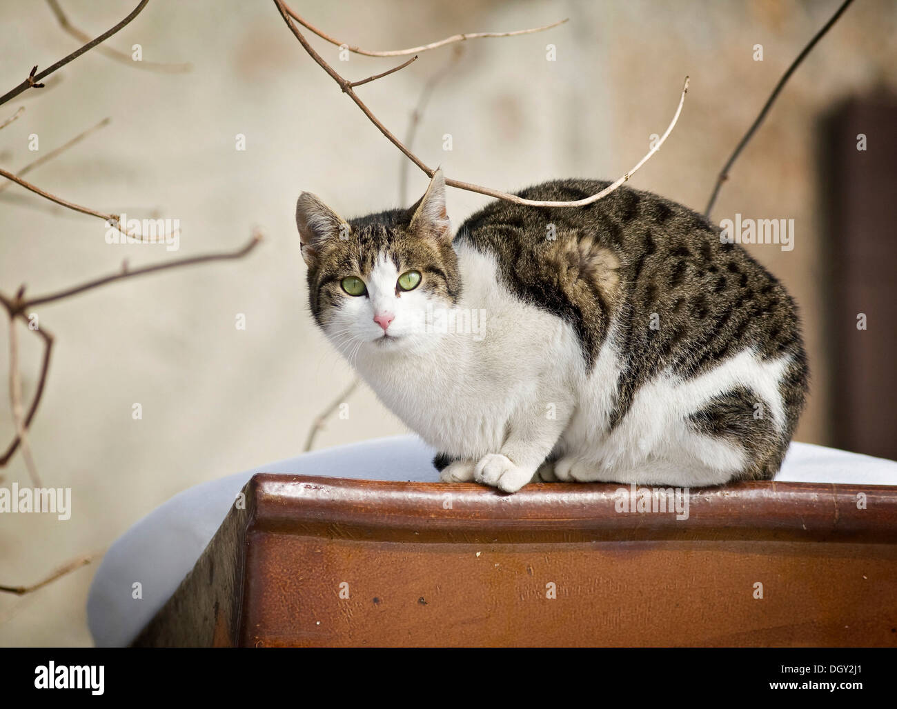 Braun Tabby Weiss Gefleckten Katze Auf Einem Keramischen Trog Im